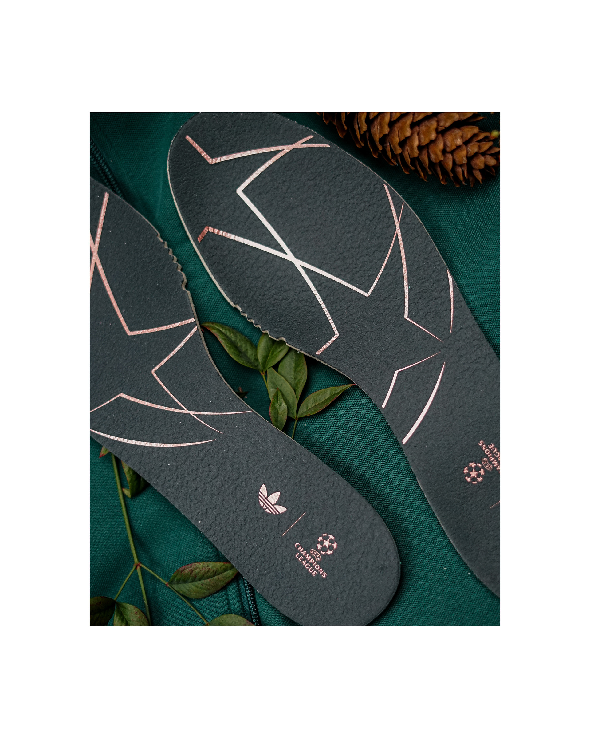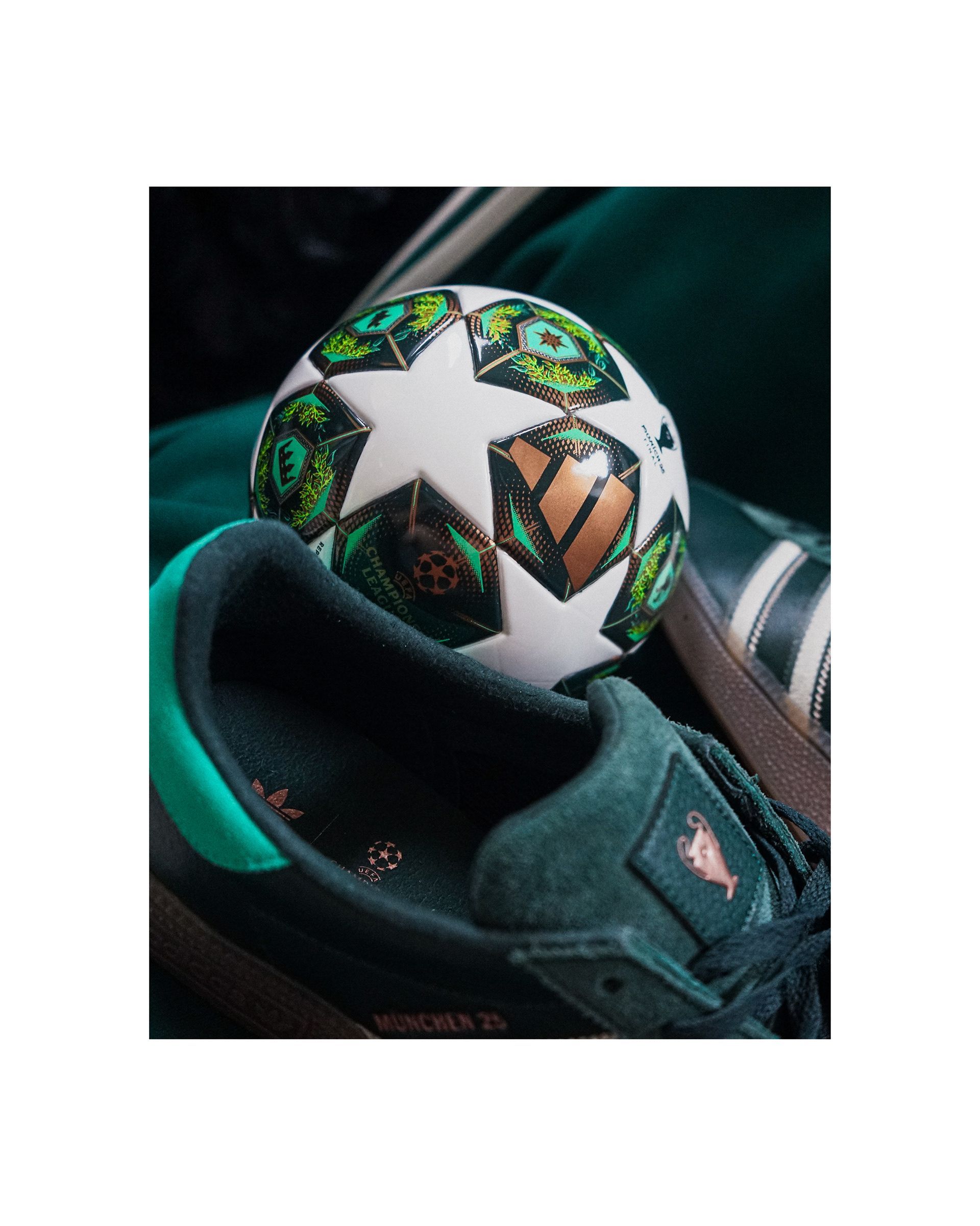 The variety of green hues in leather and suede reflect the pitch surface and the Bavarian environment, with gold UCL branding embellishments across the tongue, heel tab and insole highlighting the tournaments prestigious value. The sock liner is embossed with date of the 2025 UCL Final, making this shoe a truly iconic gift to mark a ceremonial date in both the brand and the tournament history.